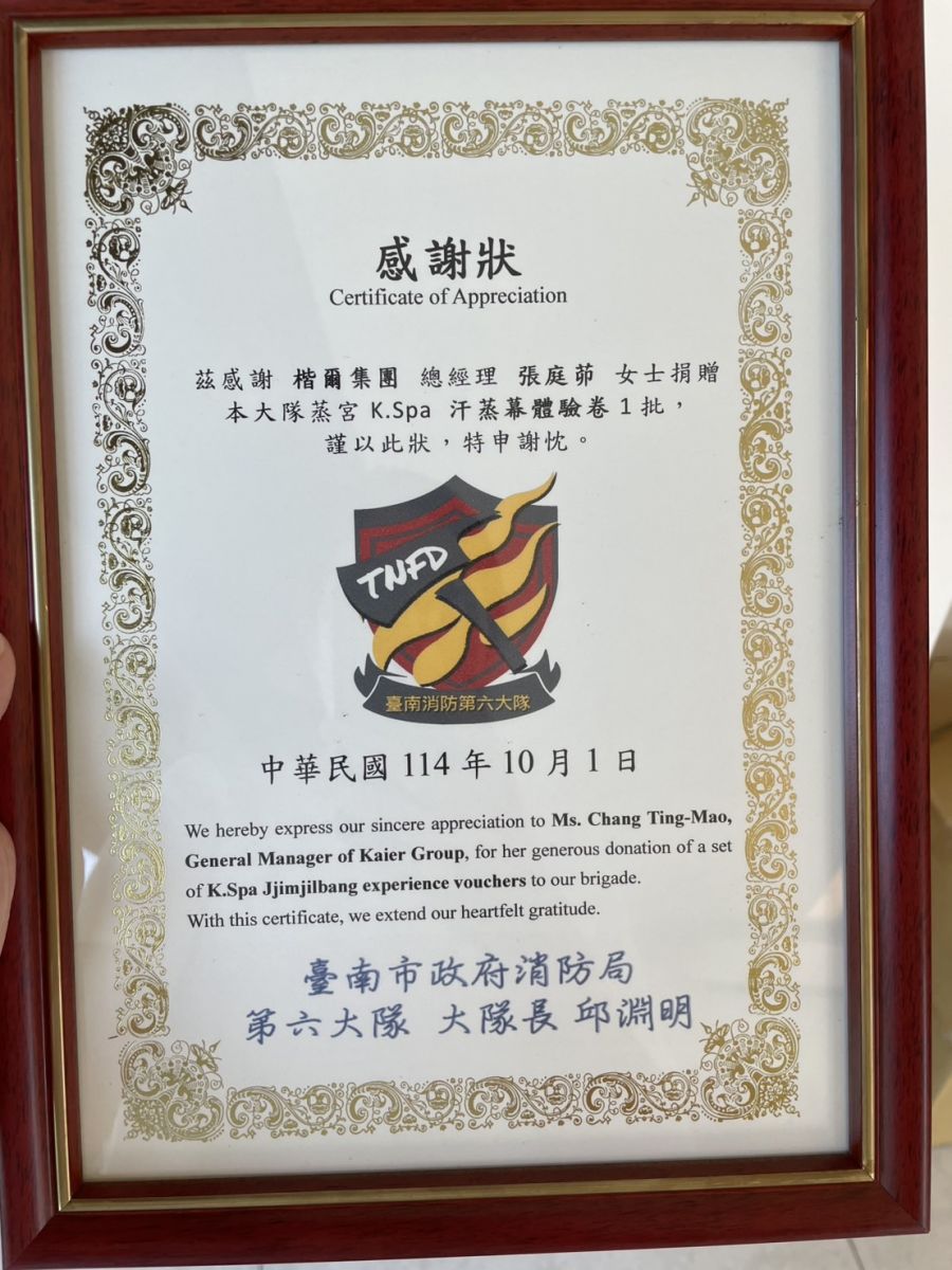 秉持「以健康為本、以關懷為志」理念,楷爾集團長年投入公益,推廣健康生活,該集團於9日舉行捐贈儀式,特別提供台南市消防局第六救災救護大隊「蒸宮汗蒸幕」服務,讓長期在高壓與高溫環境下執勤的消防人員,能在緊張任務之餘,獲得身心舒緩與療癒時光。